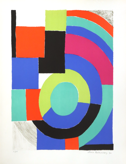 Sonia Delaunay (1885-1979) est une artiste franco-ukrainienne qui a marqué l’histoire de l’art du XXe siècle. D’abord influencée par le fauvisme, elle s’installe à Paris, où elle côtoie les grands maîtres de son époque. Avec son mari Robert Delaunay, elle développe un style proche du cubisme : Apollinaire parle ainsi d’ »orphisme » pour qualifier leur travail sur la couleur et le rythme visuel. Son concept d’« art simultané » repose sur l’interaction des formes et des couleurs vives, créant des compositions dynamiques.